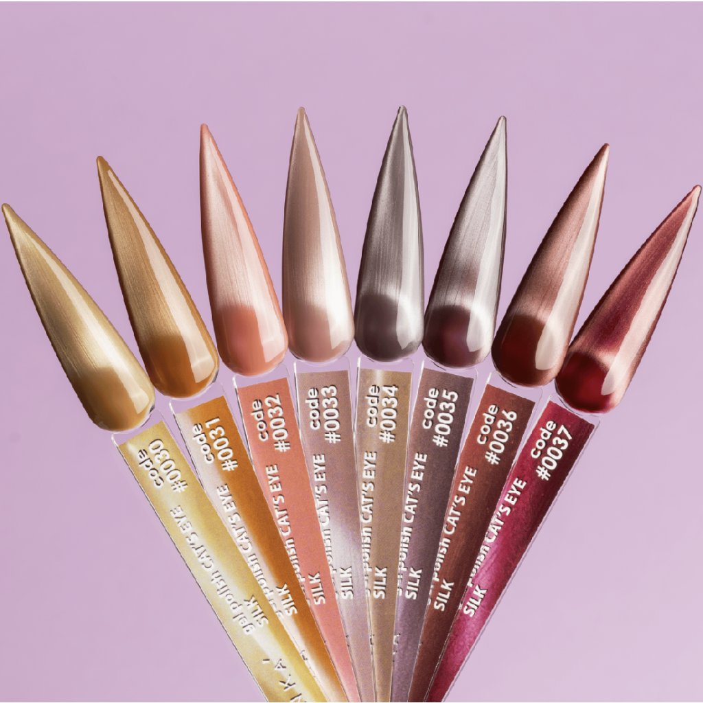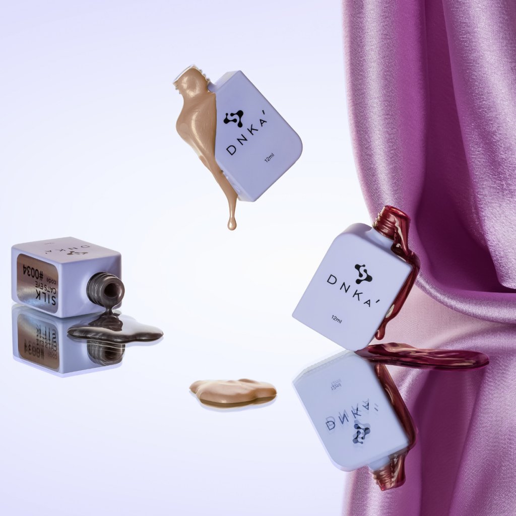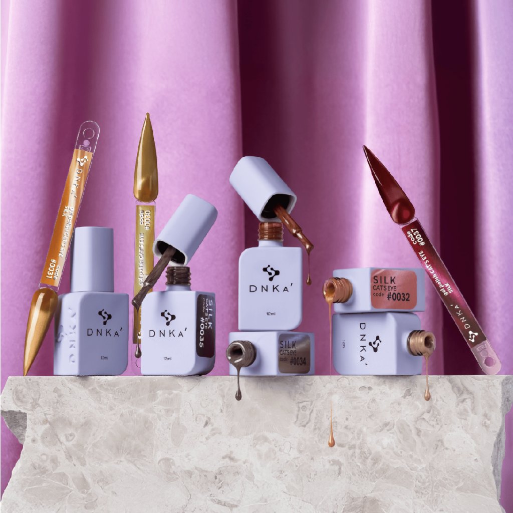 DNKa' Gel Polish Cat's Eye Silk je gél lak s magnetickým efektom, ktorý vytvára jemný hodvábny odlesk. Kolekcia obsahuje 8 elegantných odtieňov s jemnou trblietavou textúrou, ktorá reaguje na magnet a umožňuje vytvárať rôzne vzory a svetelné línie na povrchu nechtov.