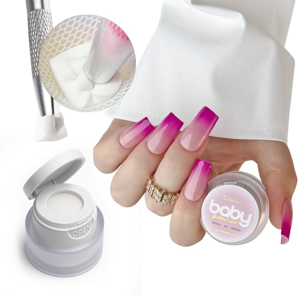 Clavier Baby Boomer Gél 3v1 je všestranný produkt určený na tri najobľúbenejšie techniky zdobenia nechtov – ombré (baby boomer), nail art a stamping (pečiatkovanie nechtov). Vďaka svojej špeciálnej krémovej konzistencii, vysokej pigmentácii a unikátnemu sieťovanému systému v kelímkusa s ním pracuje mimoriadne pohodlne a precízne.
