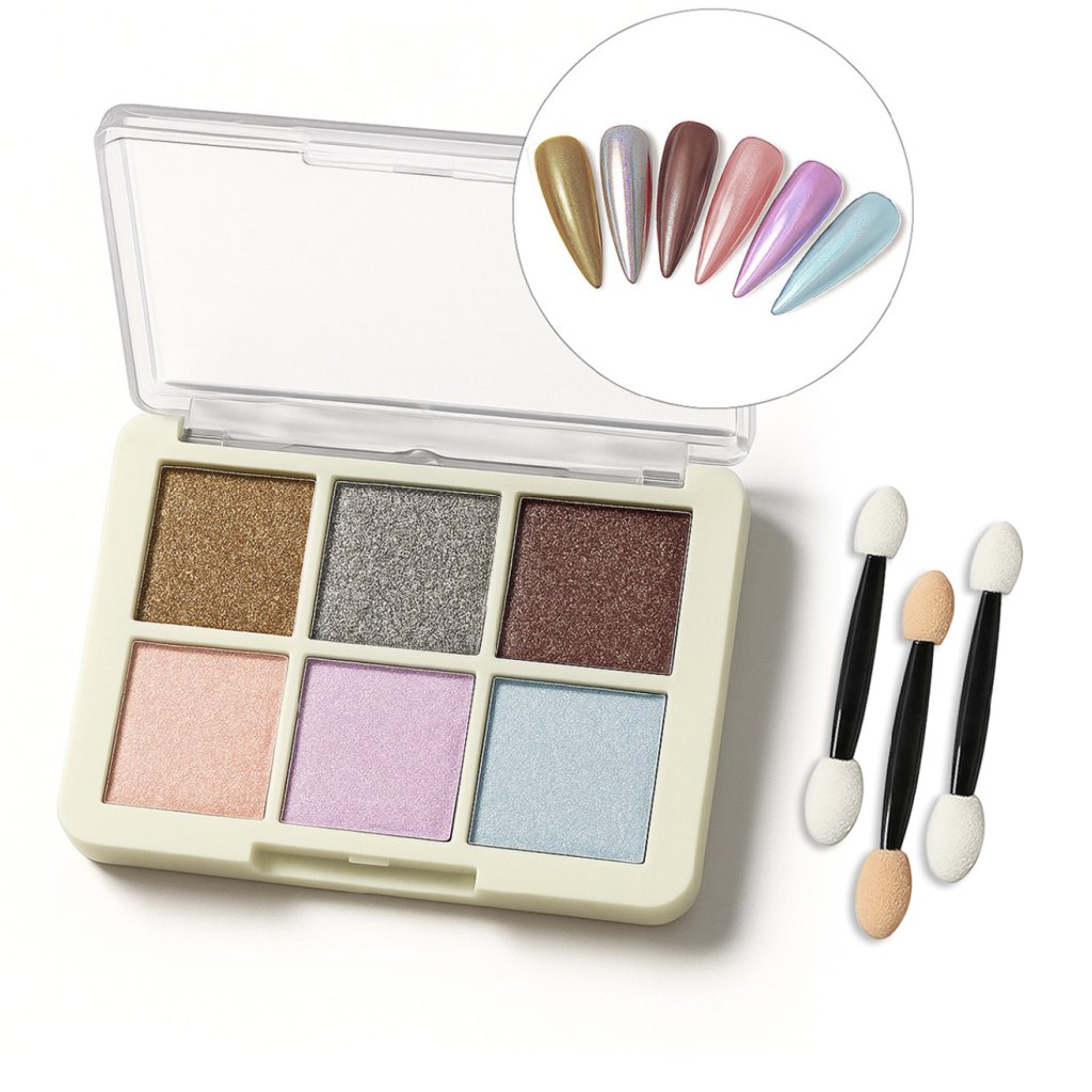 Paletka leštiacich práškov na zdobenie nechtov. 6 farieb, zrkadlový efekt.