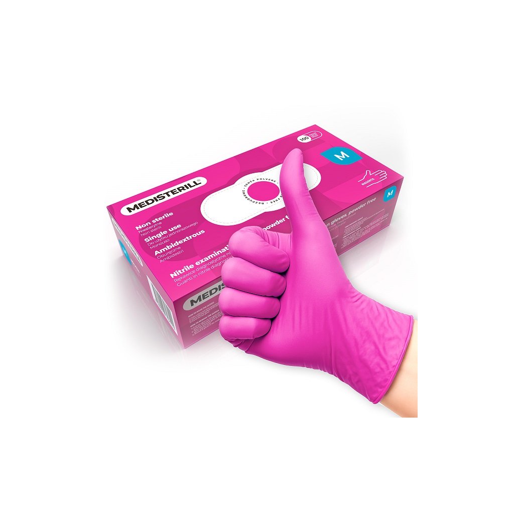 Jednorázové nitrilové rukavice Medisterill. Neobsahujú latex. V balení 100ks. Veľkosť M, ružová farba.